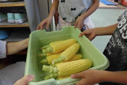 きれいになったトウモロコシは、調理員さんに手渡されました。