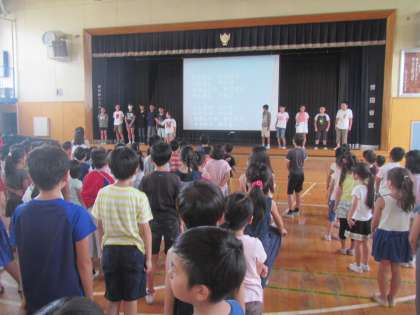 体育館に全校が集まり、若小班の隊形で整列をします。