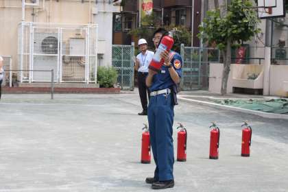 今日は避難訓練の最後に、街づくりセンターの方から、消火器の正しい使い方について教えていただきました。