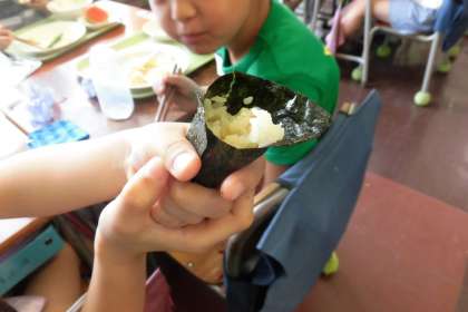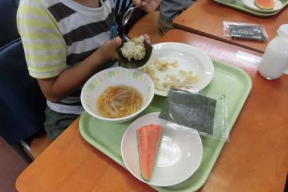今日の給食は、手巻き寿司でした。子どもたちは、上手に海苔にご飯を巻いて、楽しくおいしくいただきました。七夕汁(沢煮)やスイカもあって、七夕にちなんだメニューにみんな大喜びでした。