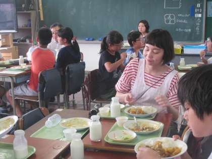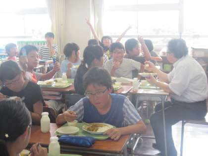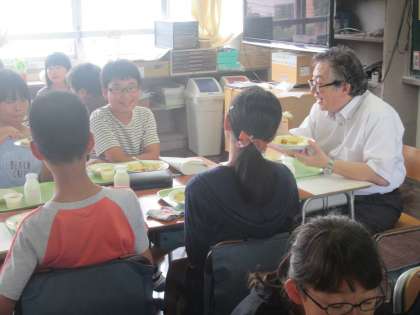 緊張しながらもいろいろお話しながら給食を進める6年生。