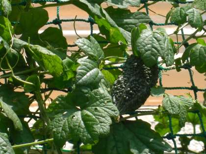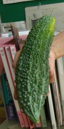 4年生が育てたゴーヤです。職員室の緑のカーテンになっています。たくさんの葉の中に大きな大きなゴーヤの実がなっているのを見つけました。4年生は大喜びです。担任の森先生といっしょに、主事さんにも手伝ってもらって収穫しました。