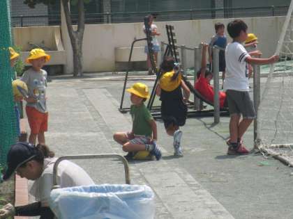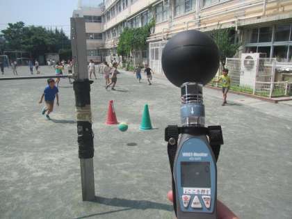 看護当番の先生は熱中症指数をはかりながら子どもたちを見守ります。
