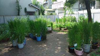 5年生が総合的な学習の時間に育てているバケツ稲。