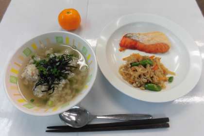 【献立】梅茶漬け・鮭の塩焼き・切り干し大根の煮つけ・冷凍みかん・牛乳