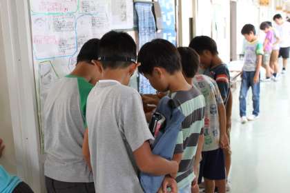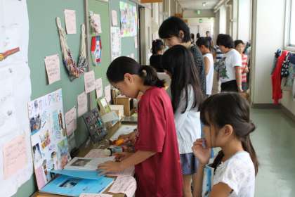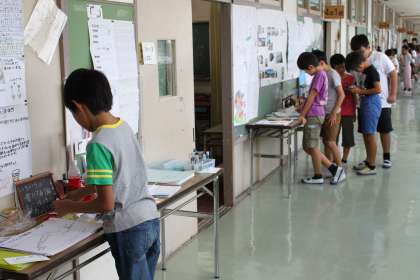 休み時間になると、子どもたちは校舎のあちらこちらに出かけて自由研究作品を見学します。