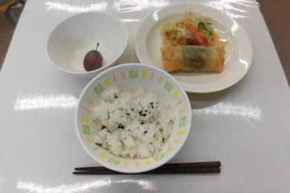 【献立】わかめごはん・ささみのチーズ春巻き・中華サラダ・プルーン・牛乳