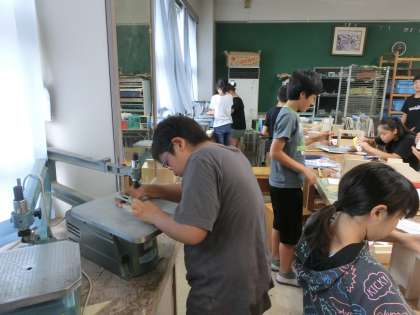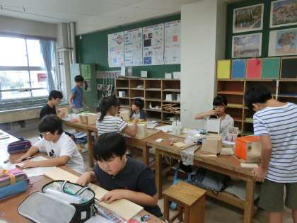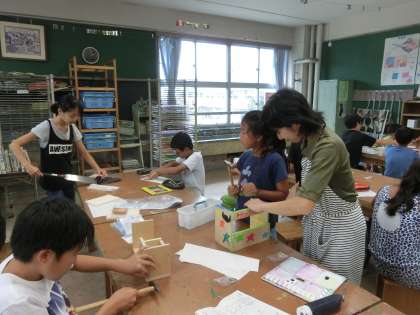 図工の時間では、のこぎりを使って板を切ったり、組み合わせたりしました。