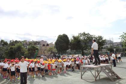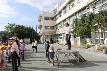 今日は運動会に向けて、整列とラジオ体操について、体育朝会の中で学びました。
