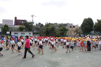 先生の号令にあわせ、きれいに体操隊形に開きます。