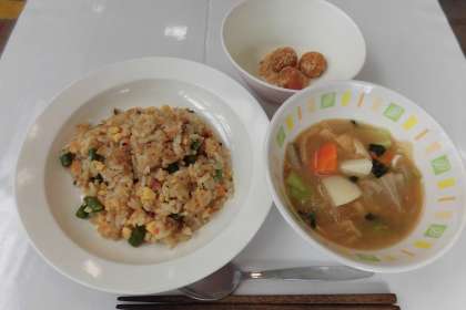 【献立】そぼろごはん・みそ汁・月見団子・牛乳