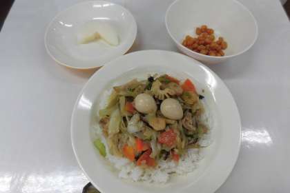 【献立】中華丼・スパイシービーンズ・梨・牛乳
