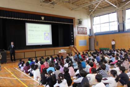 体育館に集まった全校児童。
