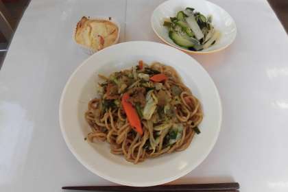 【献立】ソース焼きそば・じゃこサラダ・りんごケーキ・牛乳