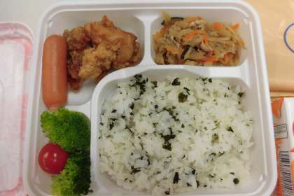 【献立】わかめごはん・とりのから揚げ・ウィンナー・ブロッコリー