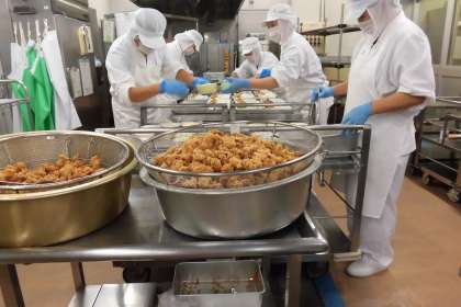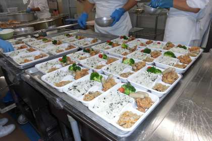 料理ができあがり、みんなでお弁当を詰めている様子です。手際良さと、チームワークの良さで、次から次へとお弁当が完成しました。