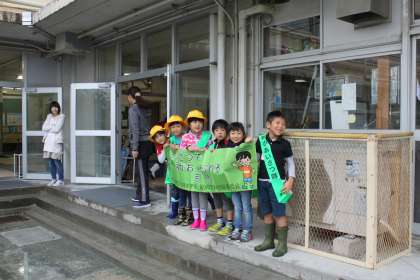 学級別あいさつ運動の口火を切る1年1組の子達。