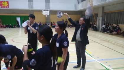 タイムアウトの度に校長先生がうちわで選手を仰ぎます。