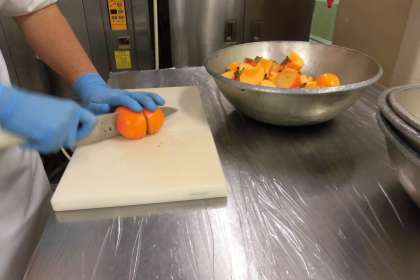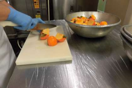 奈良県からおいしい柿が届きました。1・2年生は1個を8等分したものを2こずつ、3年生以上は4等分したものを1個ずつです。1年から6年まで全員同じ量ですが、1・2年生で2個食べられない人は、お友達に1個あげるなどして食べました。