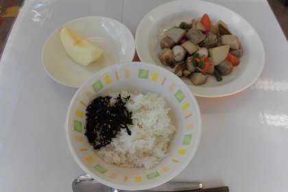 【献立】ごはん・ひじきのふりかけ・とり肉と里芋のうま煮・りんご・牛乳
