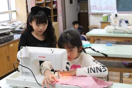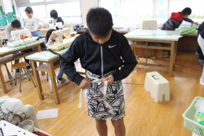5年生は家庭科の時間にカフェエプロンの制作をしました。