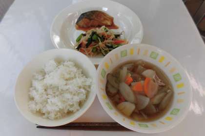 【献立】ごはん・さばのみそ煮・おひたし・根菜汁・牛乳