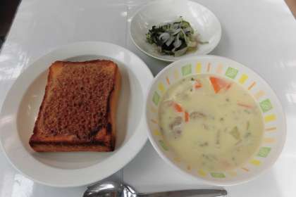 【献立】セサミトースト・じゃこ入りサラダ・チャウダー・牛乳