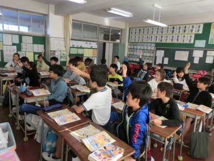 それぞれ、旅をしたら食べてみたい料理や見てみたい名所、観戦したいスポーツなどを挙げ、英語で発表しました。