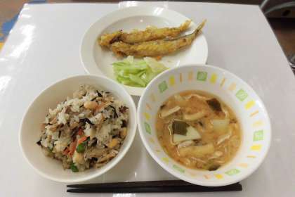 【献立】豆入りひじきごはん・ししゃものカレー天ぷら・キャベツの甘酢かけ