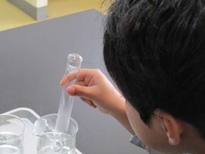 今日は試験管に閉じ込めた空気を温めて、かさの変化を確認しました。