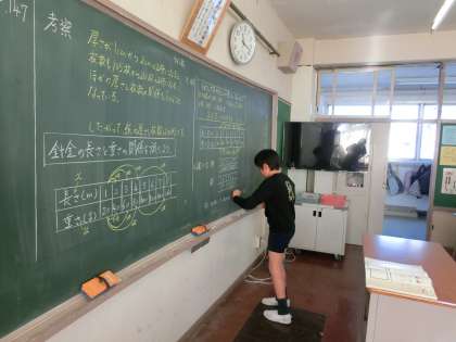 自分の考えを黒板に書き、みんなの前で意見を述べます。