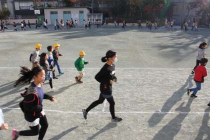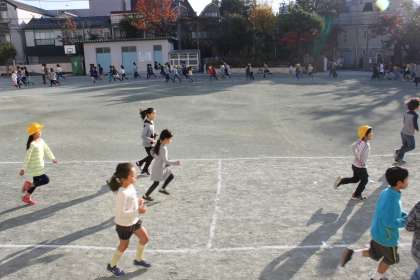 朝日のまぶしい校庭で、子どもたちが元気に走っています。
