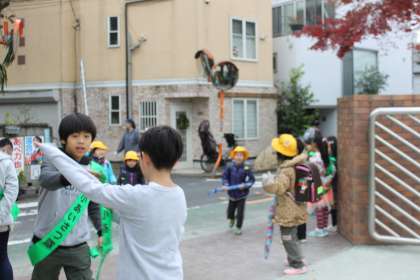 今朝は若小班1班の子達があいさつ運動に参加しました。
