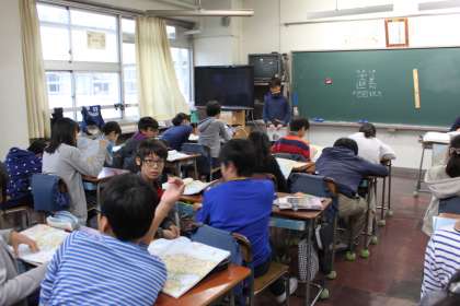 6年生が地図を見ながら、目的地を探すゲームをしています。