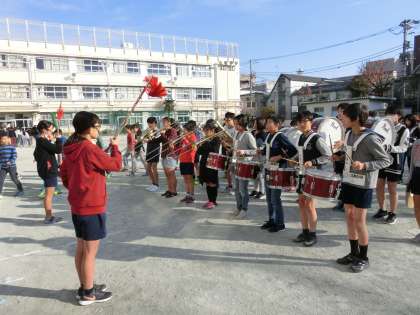 今日の全校朝会でも、鼓笛隊が退場の曲を演奏しました。