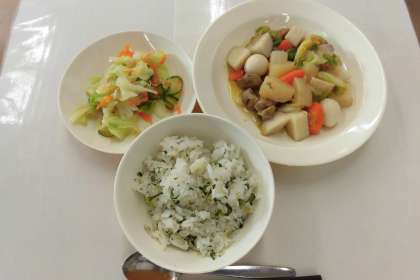 【献立】青菜とじゃこのごはん・豚肉と大根のうま煮・野菜の甘酢かけ・牛乳