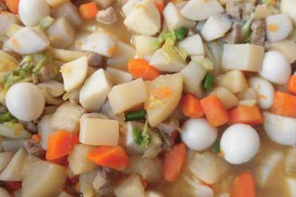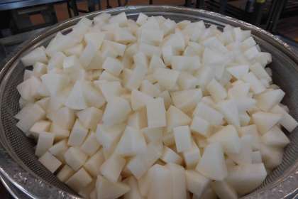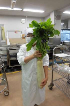 今日の給食ではせたがやそだちの野菜を使いました。かかえるほど大きな大根(大蔵大根)でうま煮を、そしてこの大根の葉を使ったごはんなど、せたがやそだちの大根のおいしさをおもうぞんぶん味わいました。大蔵大根は煮物に適した大根で、柔らかく甘みのある味でした。また、野菜の甘酢かけに使ったキャベツも「せたがやそだち」です。
