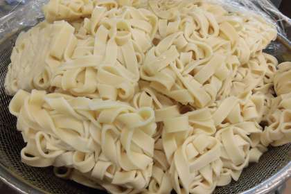 ほうと麺は冷凍されているものを仕入れました。麺の幅が1センチから1.5センチもある幅広麺でした。できあがったばかりの「ほうとう」は実は、南瓜と里芋がまだ堅い状態でしたが、子どもたちが食べるころは、口に入れたとたん崩れるほどの柔らかさでした。絶妙な状態に仕上げてくれた調理師さんに感謝です。