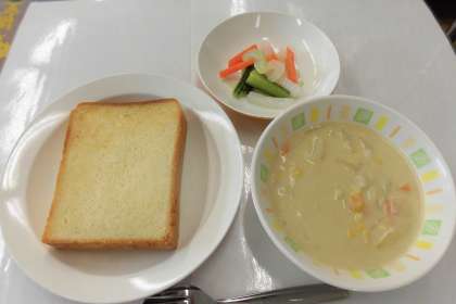 【献立】バタートースト・コーンシチュー・ピクルス・牛乳