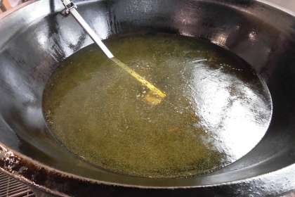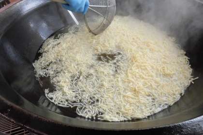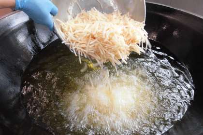 せん切りにしたじゃがいもは、水にさらしてから油で揚げます。油の温度を確かめてじゃがいもを入れます。多く入れすぎないように注意し、15分位かけてゆっくりと揚げます。