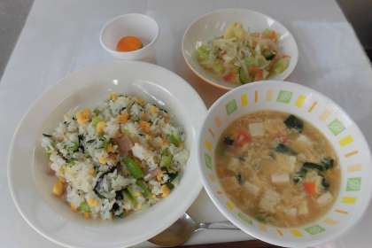 【献立】青菜のチャーハン・春雨サラダ・中華風コーンスープ・きんかん・牛乳