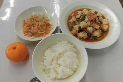 【献立】ごはん・四川豆腐・もやしのごま醤油かけ・みかん・牛乳