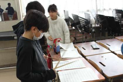 馴染みのない楽器にも果敢に挑戦する5年生たち。