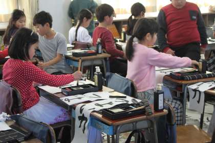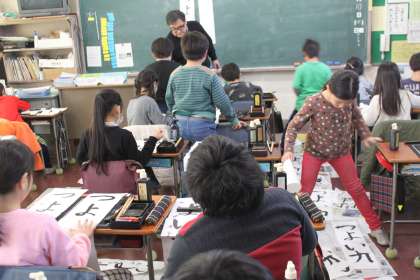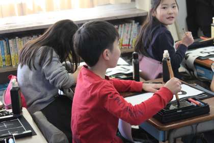 先生の説明をよく聞き、力強い字体が半紙の上に出現!