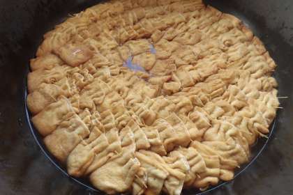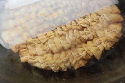 大きな釜にいなり巾着をならべ、オーブンペーパーを落とし蓋代替わりにして煮ます。味を含ませるために、弱めの火で40分ほど煮ました。