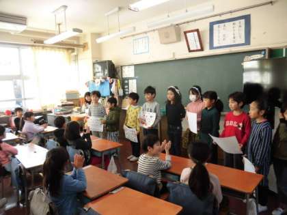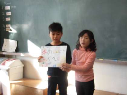 2年生が、昔遊び集会で開くお店を、1年生に宣伝しました!