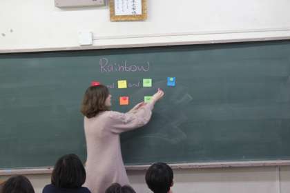 アリョナ先生が教えてくれたレインボーソングで、色の言い表し方を覚えます。