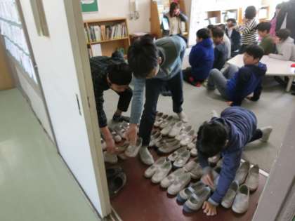 3名の男子児童が友達の上履きをきれいに並べ替えています。