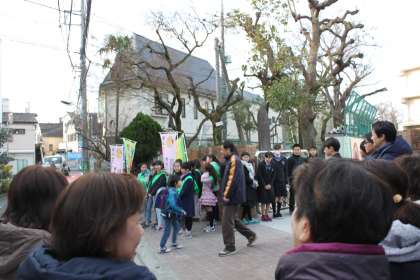 世田谷中学校の生徒さん、地域の皆様、そして5年生が一堂に会し、迫力のある若小の正門となりました。