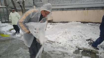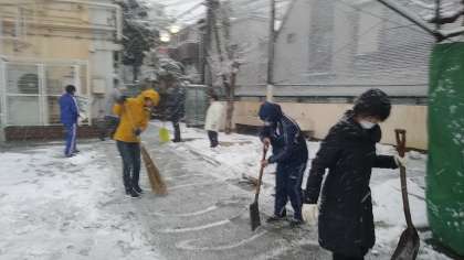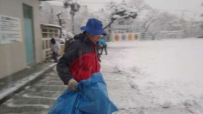 会議を終えた先生たちは、校庭で雪かきをしました。